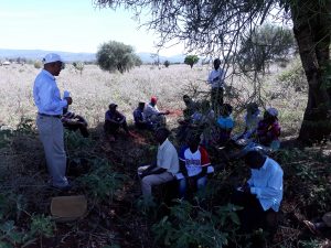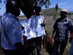 The meeting and field planning was organised by Atanas Ndanu, a farmer in the community who has been working with Liana for many years as the leader of water tank and stove building. Eija Soini from Liana and Anenmose Maro and Emmanuel Challo from LWDO joined the meeting. Fourteen farmers were selected to visit the villages of Sango and Kiboroloni where some successful land rehabilitation has been done. There will be check dams to see (both correctly built and badly built: good for learning!) and terracing by fanya chini method and grass strips.